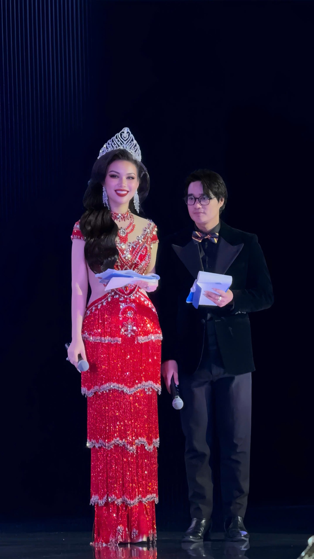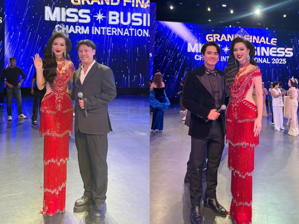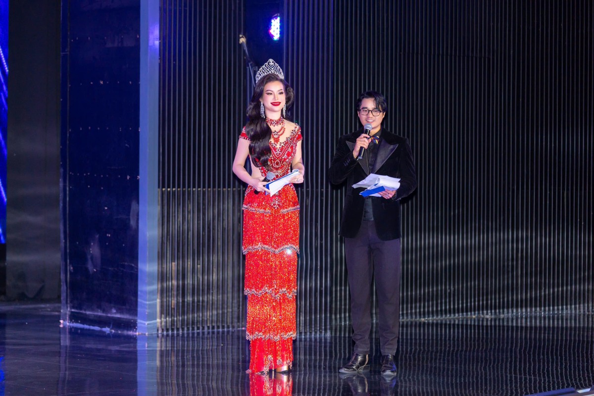 (Hoa Hậu Jennifer Ly và MC Bá Niên đồng dẫn trong phần thi ứng xử của Top 5 Miss Business Charm International 2025)